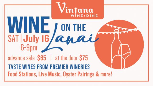 Mark your calendars Saturday, July 16th for Wine on the Lanai at Vintana. Taste wines from your favorite wineries and enjoy delicious Vintana bites!